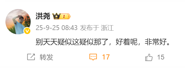 9月25日,洪尧回应:别天天疑似这疑似那了,好着呢,非常好。